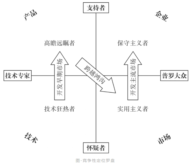 通常来说,公司推出新产品,通过优秀的技术和产品策略,可以把新产品成功推向早期市场的两波用户(创新者和早期采用者)。然而,从早期市场过渡到主流市场,拿下主流市场的两波用户(早期大众和后期大众),才是决胜的关键。