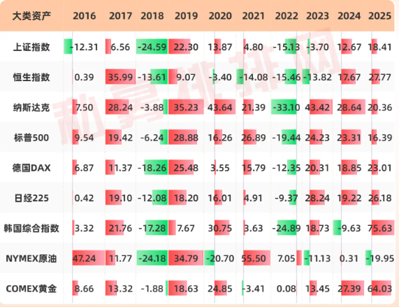 2022年美联储激进加息叠加俄乌冲突,原油等成为少数正收益资产;2023年AI浪潮启动,纳斯达克大涨43.42%领涨全球;2025年降息周期开启叠加AI业绩兑现,黄金以超64%涨幅成年度强势大宗商品资产,美股、A股、港股同步录得可观涨幅。