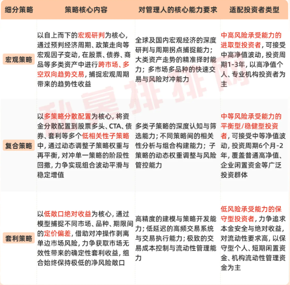 目前,多资产策略常见的子策略包括宏观策略、复合策略、套利策略。三类子策略均以大类资产配置为底层框架,但在收益来源、风险收益特征上存在显著差异,分别适配不同风险偏好、投资周期与收益目标的投资者。