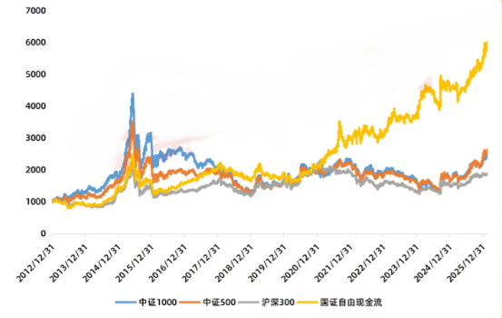 根据国证指数官网统计,截至2026年2月27日,国证自由现金流指数自基日(2012年12月31日,基点1000点)以来累计涨幅达504.23%,年化收益率约14.64%,显著跑赢沪深300、中证500、中证1000等主流宽基指数。
