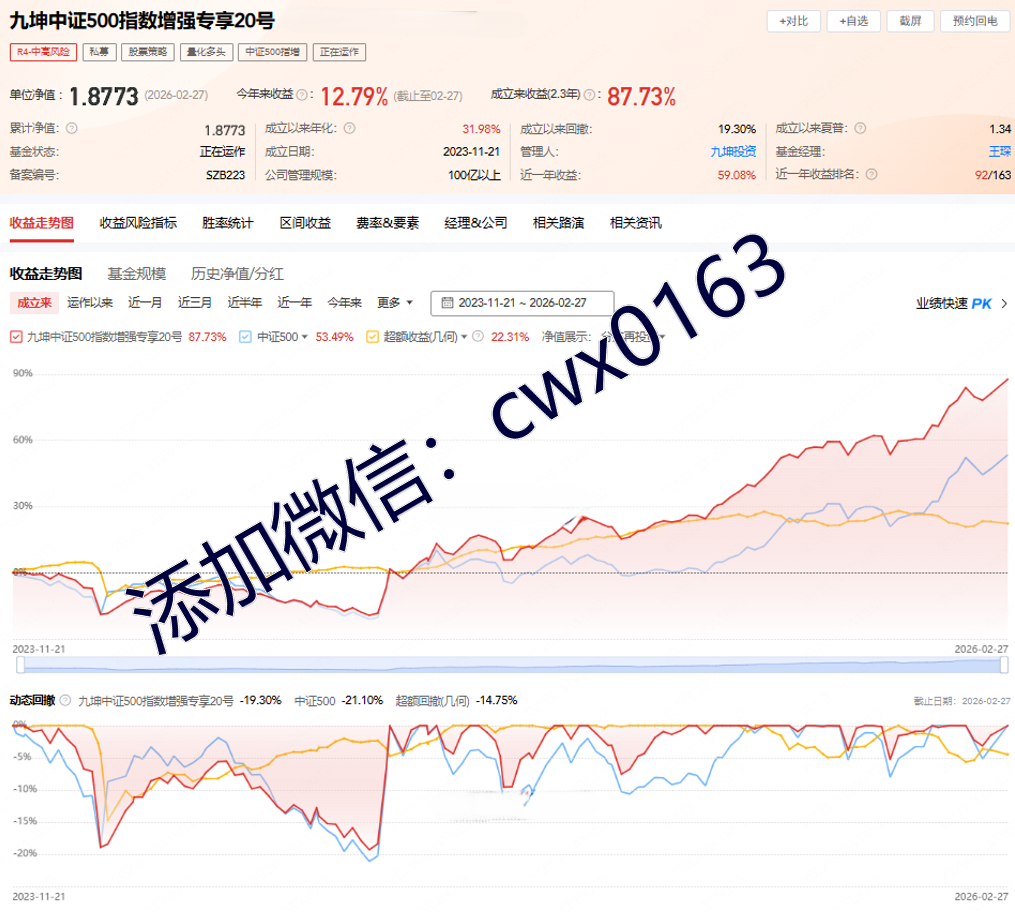 经过十数年的发展沉淀,九坤投资已成长为一家立足中国面向全球的量化对冲基金。依托于国际化的数学、物理、计算机等专业领域顶尖人才,将人类最前沿的研究和技术与金融投资紧密结合,致力于为投资人创造长期稳健的投资价值。免费帮助投资人进行私募产品分析,100万起投优质产品推荐,欢迎添加微信cwx0163