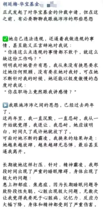 2026年2月底,华宝基金前员工胡延梅在朋友圈发布实名举报。她指控华宝基金北京分公司负责人施沛沛存在职场霸凌行为。胡延梅表示,施沛沛逼迫她进行违规操作。胡延梅还提到,施沛沛曾对她说:“你连这么点违规的事情都不敢干,就这么缺这份工作吗?”胡延梅强调,这件事发生在办公室监控范围内,并有其他同事在场。头部私募基金,长期跟踪帮助投资人分析市场,根据市场走势配置私募产品,欢迎添加我微信cwx0163