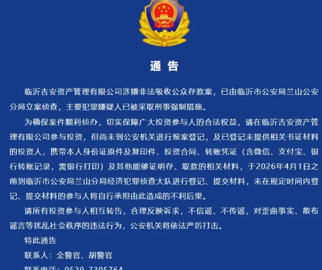 通告称,为确保案件顺利侦办,切实保障广大投资参与人的合法权益,请在临沂吉安资产管理有限公司参与投资,但尚未到公安机关进行报案登记,及已登记未提供相关书证材料的投资人,携带本人身份证原件及复印件、投资合同、转账凭证(含微信、支付宝、银行转账记录,需银行打印)及其他能够证明存、取款的相关材料,于2026年4月1日之前到临沂市公安局兰山分局经济犯罪侦查大队进行登记、提交材料,未在规定时间内登记、提交材料的参与人将自行承担由此造成的不利后果。有资产配置需求,可加微信cwx0163,获取专属建议