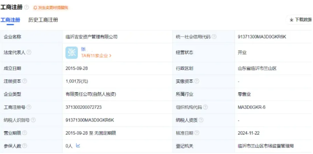 据悉,临沂吉安资产管理有限公司成立于2015年09月28日,注册地位于山东省临沂市兰山区天元国际小区1号楼30楼,法定代表人为张某。