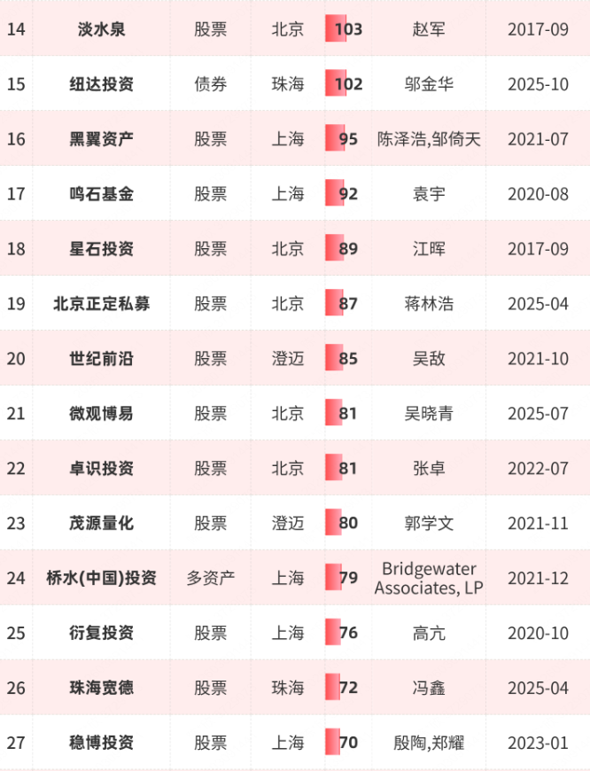图3:近1年至少增长10人的百亿私募(最新数量:27家)