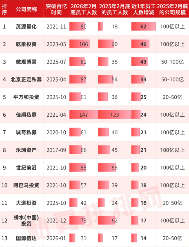 接下来,笔者将为大家盘点:百亿私募的最新全名单、2026年新晋百亿私募、近1年员工人数至少增长10人的百亿私募、突破百亿时间超过5年的私募。(注:以下业绩数据净值截至2026年2月底)