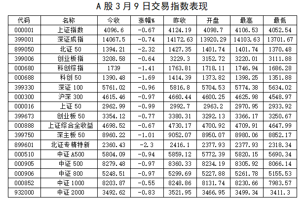 3 月 9 日 A 股全线收跌,市场呈现北交所领跌、科创 / 中小盘重挫、权重相对抗跌的结构,避险情绪显著升温。
