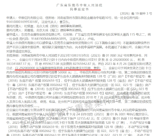广东省东莞市中级人民法院作出 (2026) 粤19破申3号民事裁定书,正式受理中原信托有限公司对东莞市金展物业投资有限公司(下称 “金展物业”)的破产清算申请,这也是房地产行业加速出清背景下,又一例物业投资企业因债务问题进入破产程序的案例。想了解信托相关信息,可加微信yxxz798