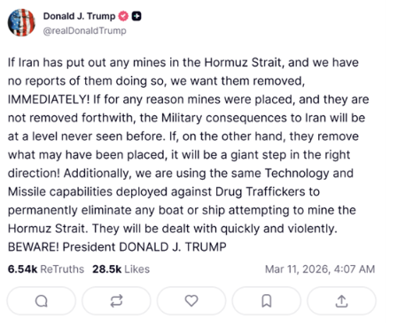 综合央视新闻报道,当地时间10日,特朗普通过社交媒体发文称,如果伊朗在霍尔木兹海峡部署水雷,必须立即将其移除,否则将面临“前所未有的军事后果”。