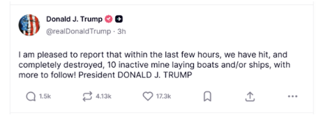特朗普随后不久又发布了一则帖子,称美军已 “彻底摧毁” 10 艘处于非活跃状态的伊朗布雷船,后续还将有更多行动。